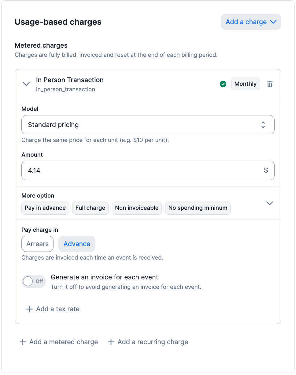 Instant charges are fees that are due as soon as the corresponding ingested events occur (in our previous examples: a transaction or an ATM withdrawal), as opposed to standard charges that are due at the end of the billing period (e.g., typically if you’re making international calls on March 15th and it’s not included in your T-mobile subscription, you’ll only pay the overage for that call by March 30th when you receive the invoice).