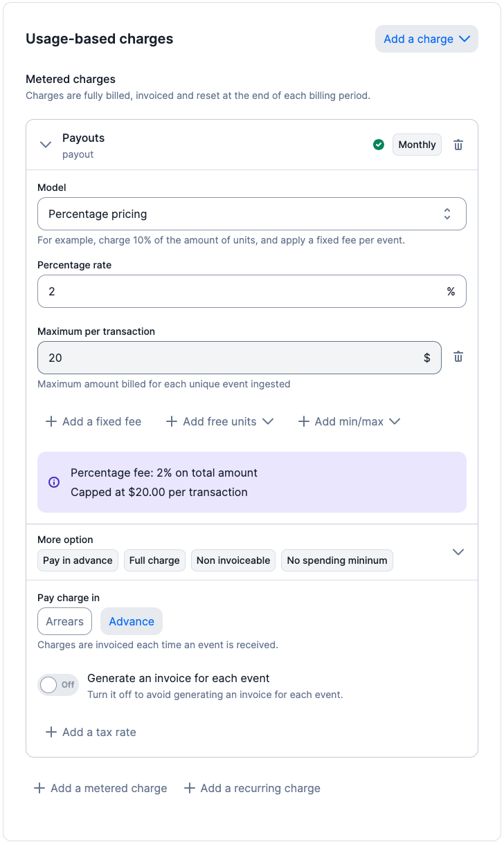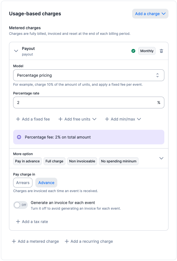 That’s why we’ve made it easy for you to provide full transparency to your end users on the amount of fee you’d be collecting with our ‘instant charge’ feature. This estimation is made in real-time by Lago, so that you can focus on your core product.