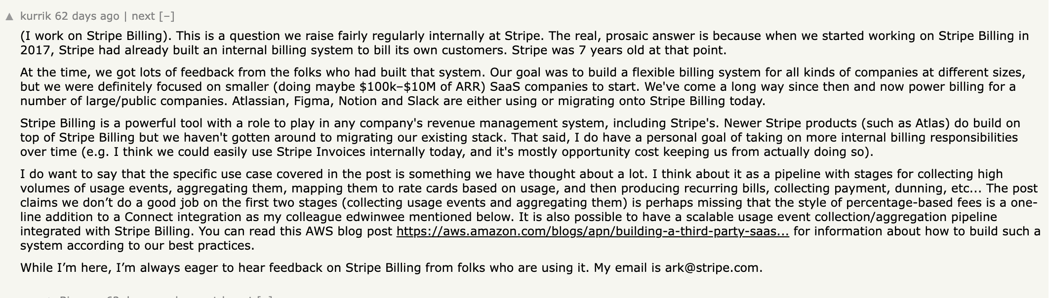 So we wrote another post (a bit depressed by the number of posts we made, that nobody cared about, but kind of persisted), this time around “why billing systems are still a nightmare for engineers”. After all these failed posts on HackerNews, we were losing hope, but it happened!