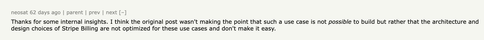 We were even blessed with an answer from the “Stripe Billing” team and, as pointed out by one of the commenters, our whole point was showing how the architecture of Stripe Billing isn’t flexible. Original post here.