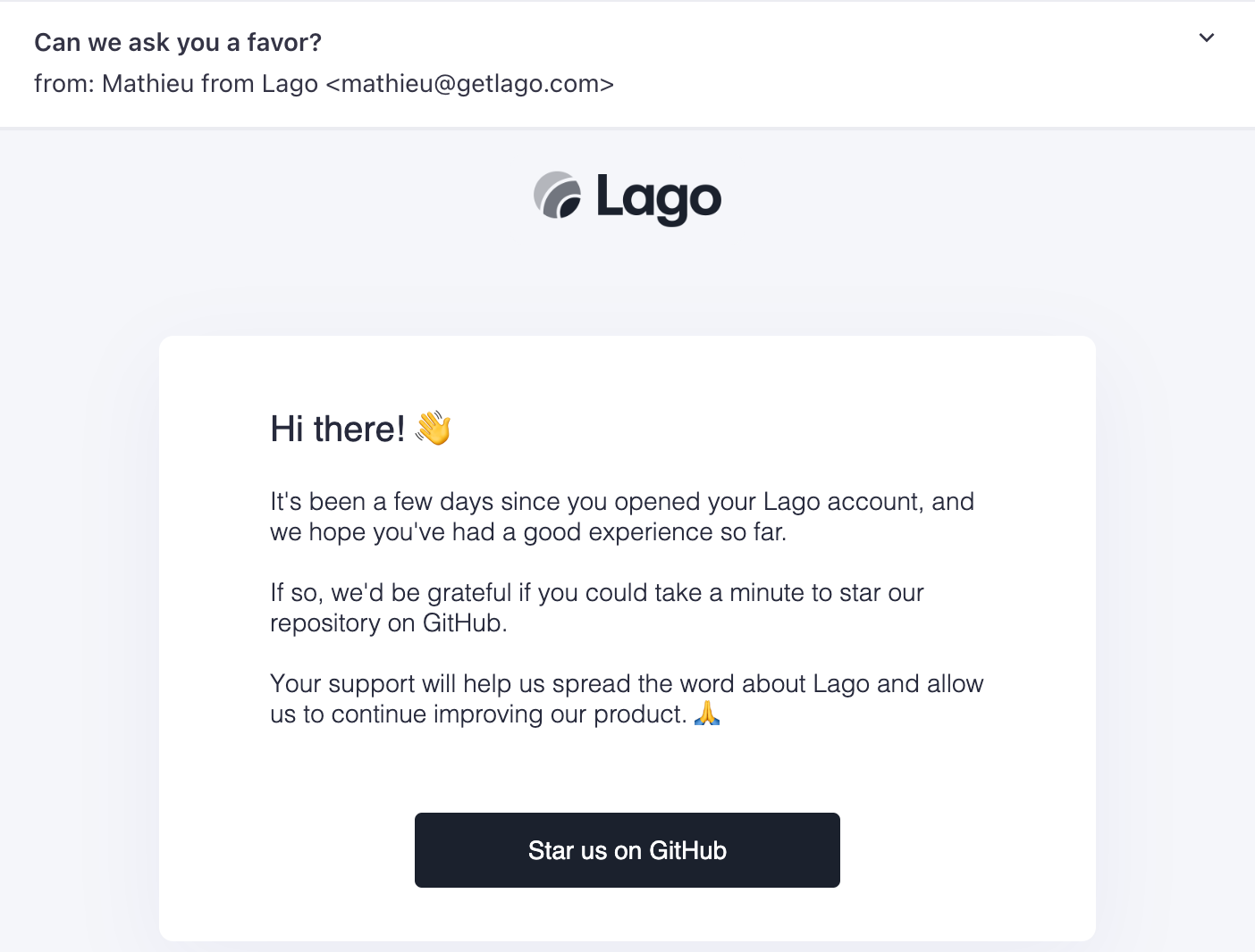 Every time a user would sign up on the self-hosted product (without opting out), we would trigger a welcome email that invites the receiver to star our Github repository and join the community.